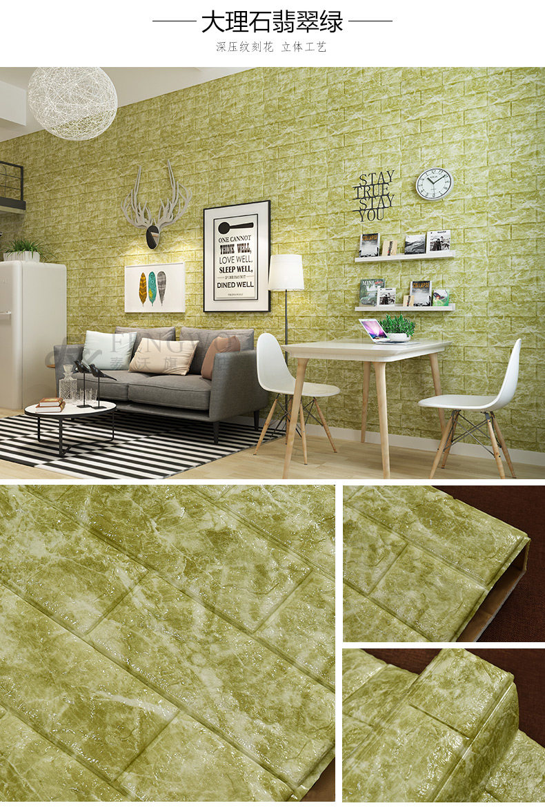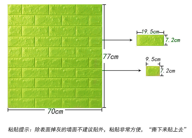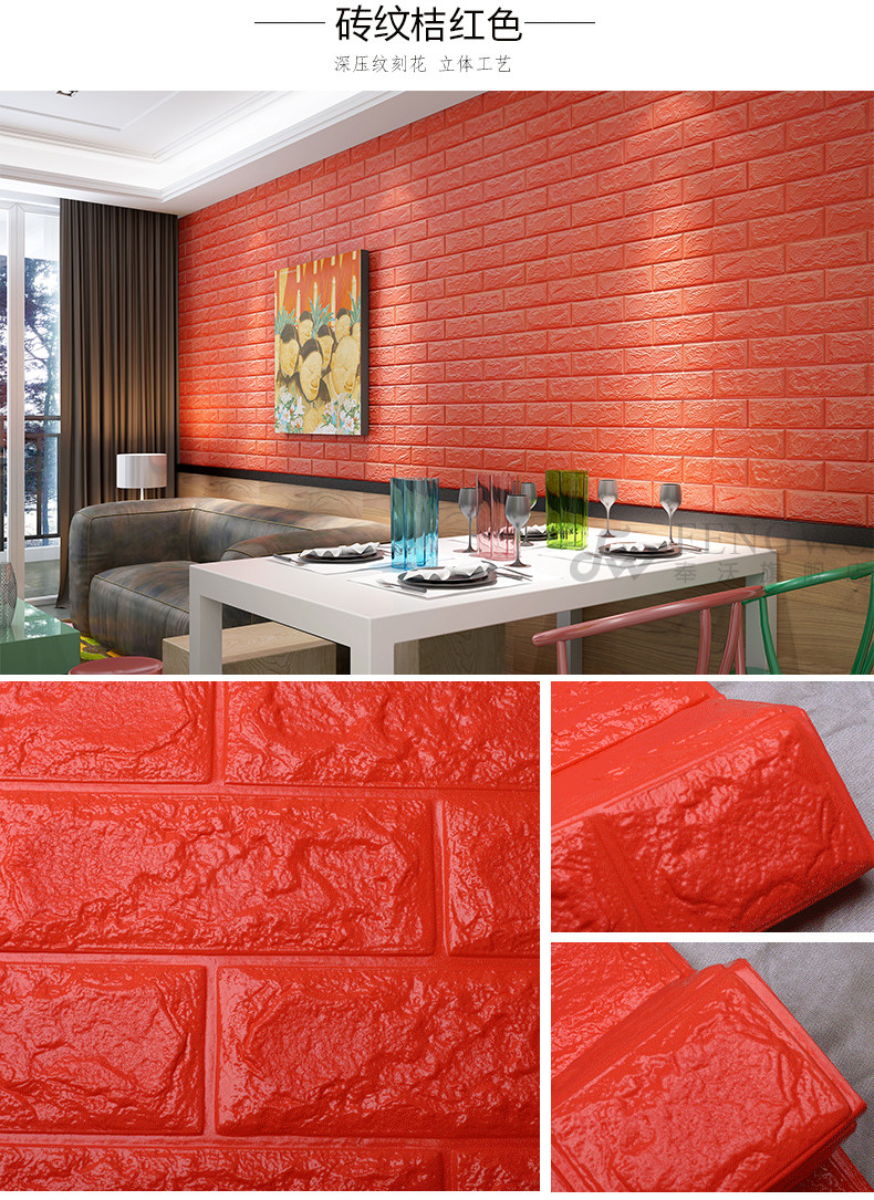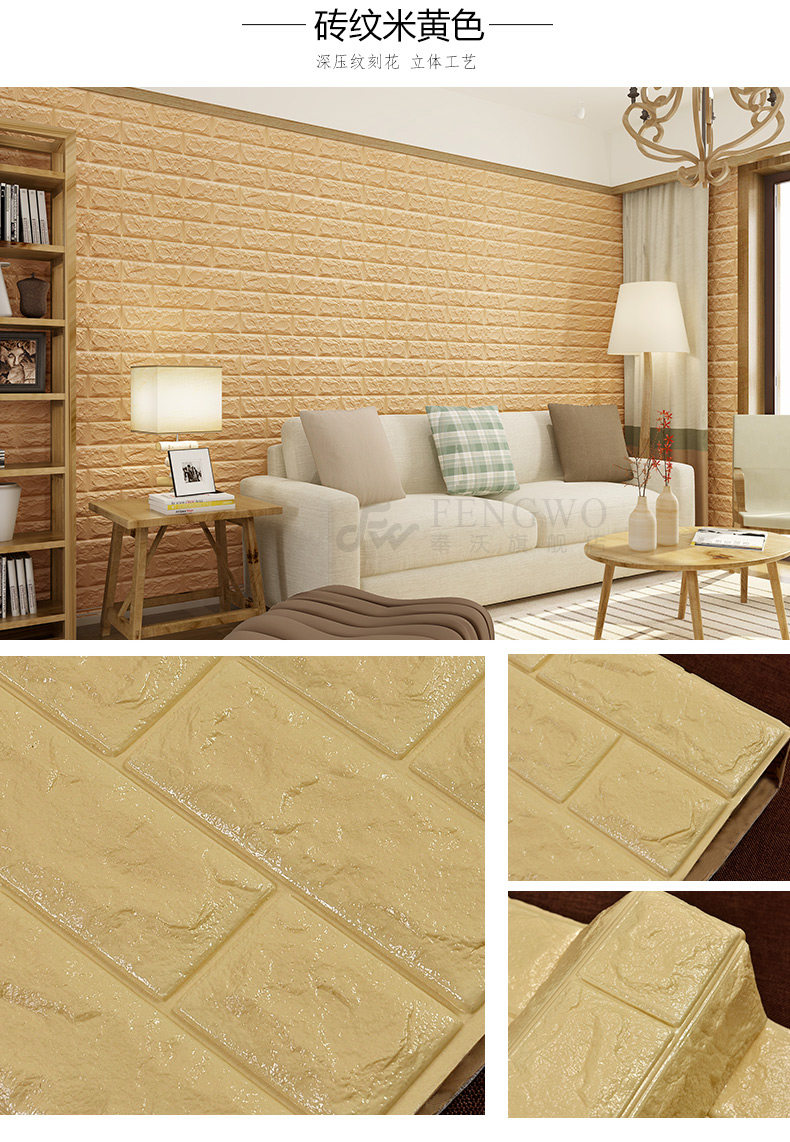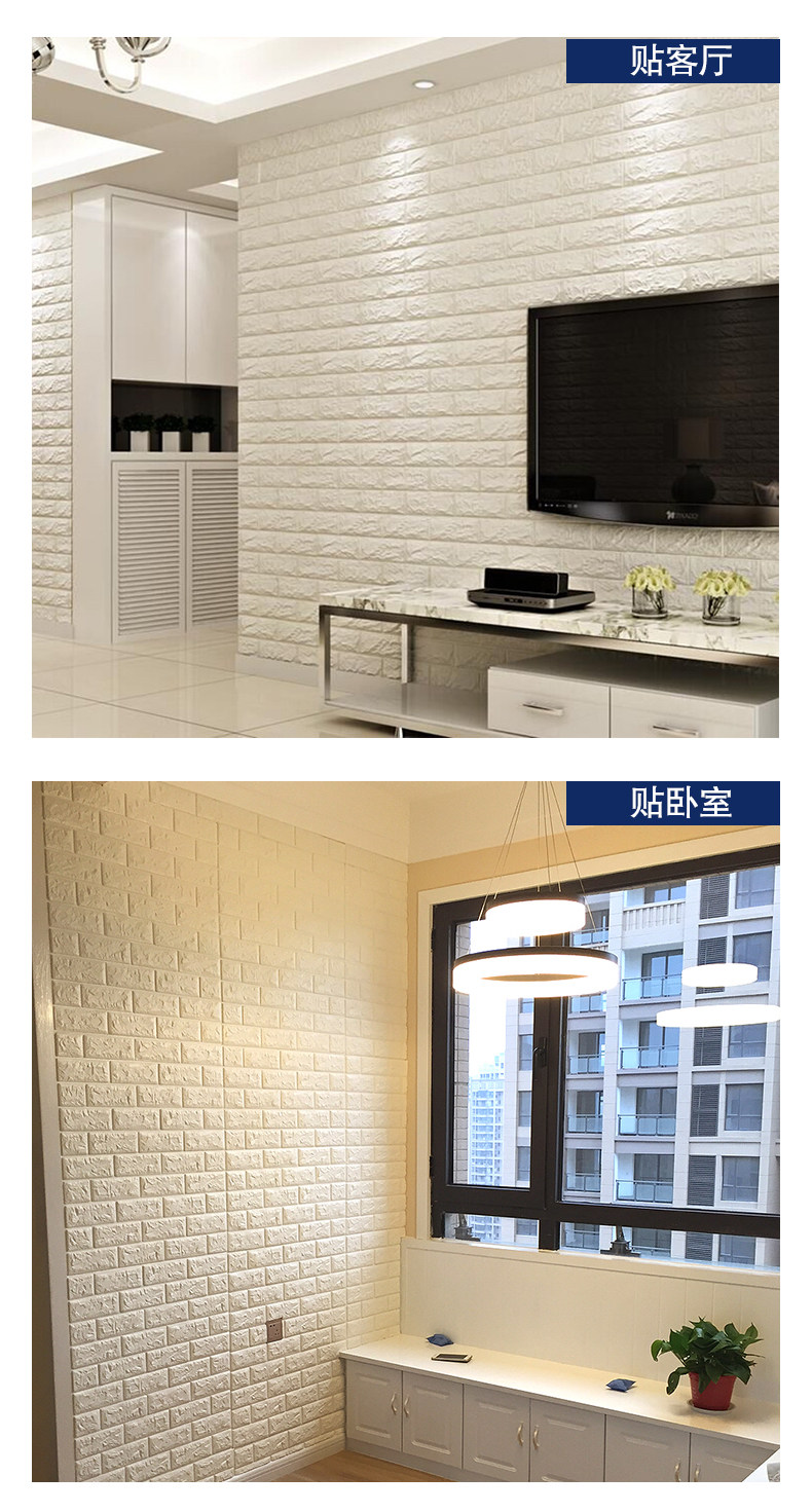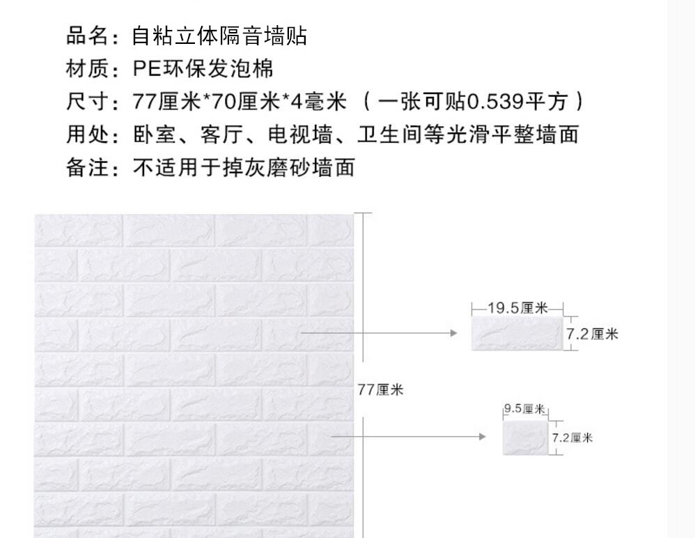 质地柔软有弹性,能更好的起到儿童防撞的效果。3D立体砖纹,优良的材质和优雅的轮廓,创造出简约纯净的格调。加厚砖纹,起到更好的隔音效果。粘贴方便,背面自带背胶,只需撕下底纸,然后贴于光滑平整面即可。