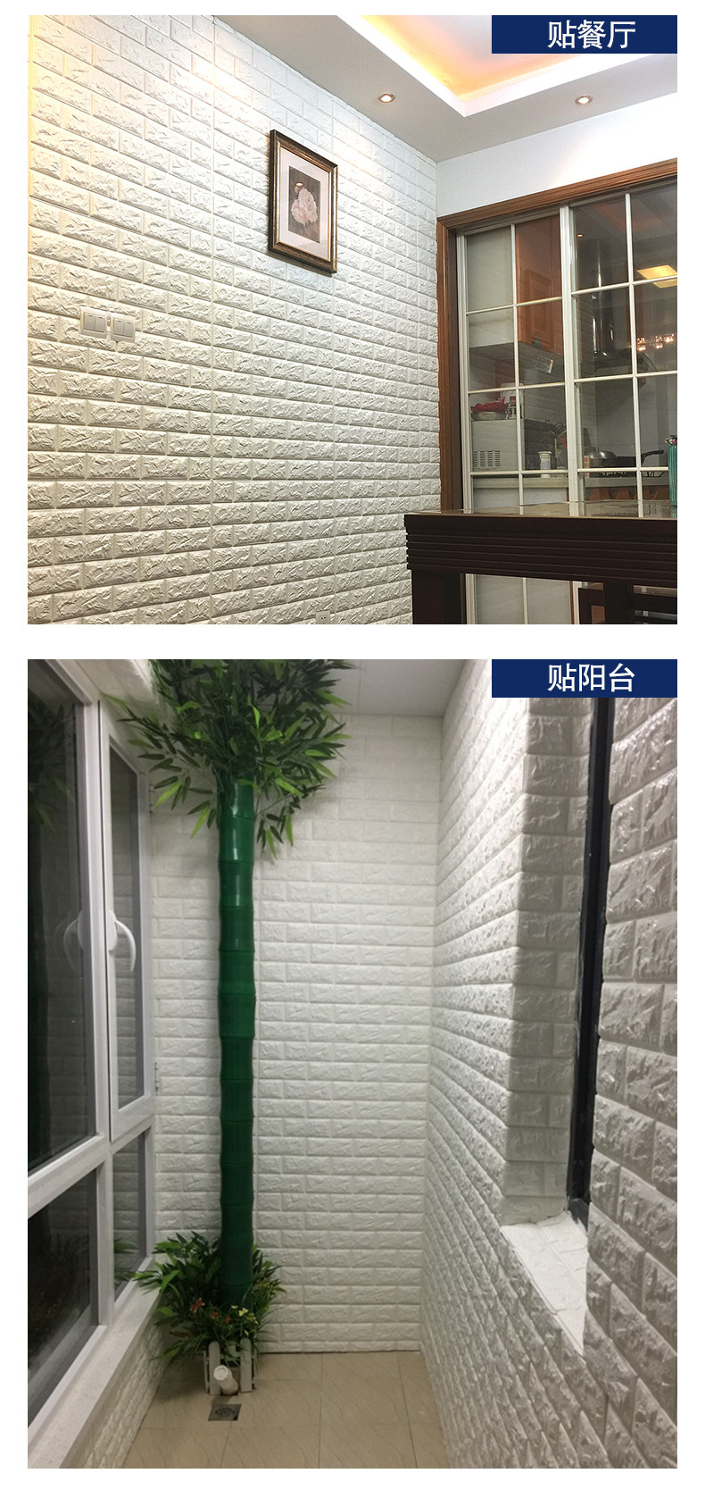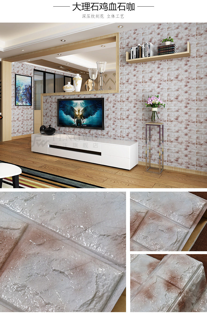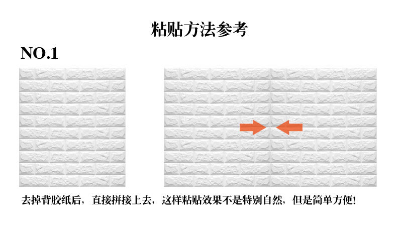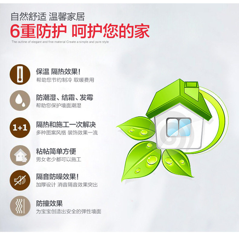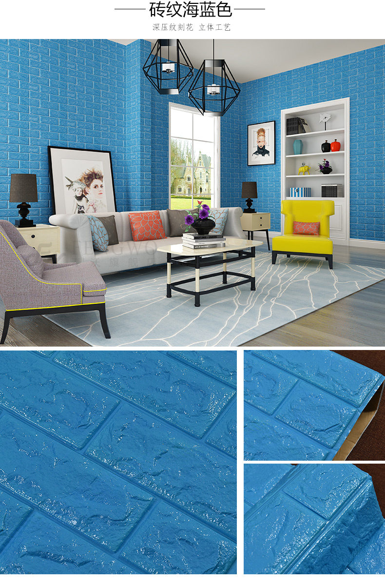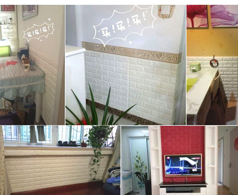 质地柔软有弹性,能更好的起到儿童防撞的效果。3D立体砖纹,优良的材质和优雅的轮廓,创造出简约纯净的格调。加厚砖纹,起到更好的隔音效果。粘贴方便,背面自带背胶,只需撕下底纸,然后贴于光滑平整面即可。