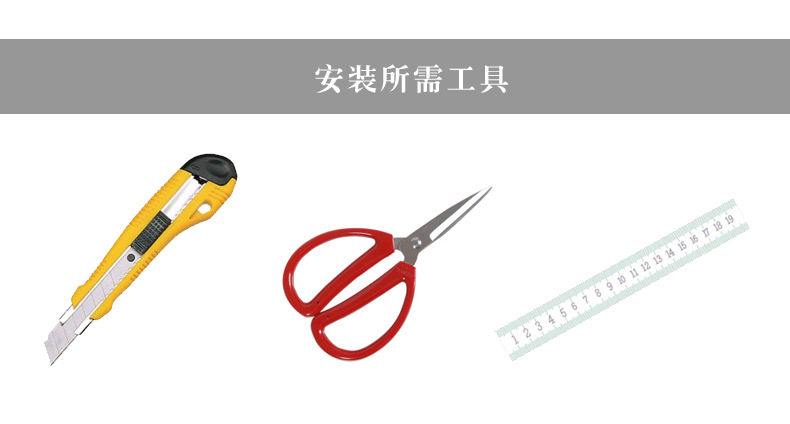 安装方法及工具准备:粘贴面干净整洁,有附着力,如:木板面,玻璃面,无粉尘的墙面,打了腻子底的墙面等
